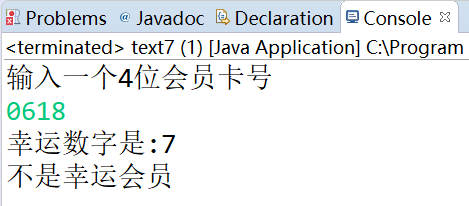 package 作业1; import java.util.Random; import java.util.Scanner; public class text7 { public static void main(String[] args) { // TODO Auto-generated method stub Scanner input=new Scanner(System.in); System.out.println("输入一个4位会员卡号"); int a=input.nextInt(); int b=a%1000/100; Random suiji=new Random(); int c=suiji.nextInt(10); System.out.println("幸运数字是:"+c); if(b==c){ System.out.println("是幸运会员"); }else{ System.out.println("不是幸运会员"); } } }