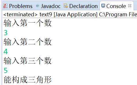 package 作业1; import java.util.Scanner; public class text9 { public static void main(String[] args) { // TODO Auto-generated method stub Scanner input=new Scanner(System.in); System.out.println("输入第一个数"); int x=input.nextInt(); System.out.println("输入第二个数"); int y=input.nextInt(); System.out.println("输入第三个数"); int z=input.nextInt(); if(x+y>z&&y+z>x&&z+x>y){ System.out.println("能构成三角形"); }else{ System.out.println("不能构成三角形"); } } }