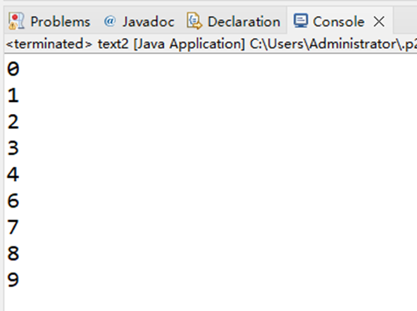 public static void main(String[] args) { // TODO Auto-generated method stub for(int a=0;a<=9;a++) { if(a==5) { continue; }else { System.out.println(a); } } }