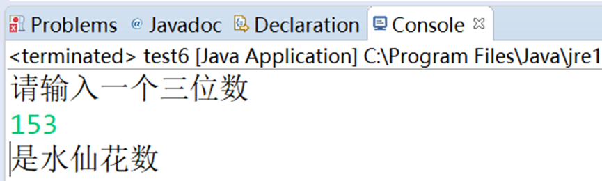 import java.util.Scanner; public class test6 { public static void main(String[] args) { // TODO Auto-generated method stub Scanner input = new Scanner(System.in); System.out.println("请输入一个三位数"); int a = input.nextInt(); int b, c, d; b = a / 100; c = a % 100 / 10; d = a % 10; int x; x = b * b * b + c * c * c + d * d * d; if (a == x) { System.out.println("是水仙花数"); } else { System.out.println("不是水仙花数"); } }
