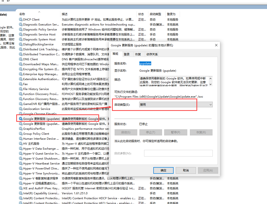 4、进入服务页面后,找到Google 更新服务 选择第一个点击,进入下面页面并选择禁用即可完成