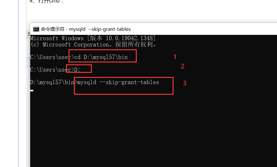 4、打开cmd : 输入后不要关闭,命令: 输入mysqld --skip-grant-tables回车