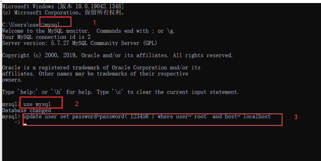 c、输入update user set password=password('123456') where user='root' and host='localhost';回车,修改之后密码为123456