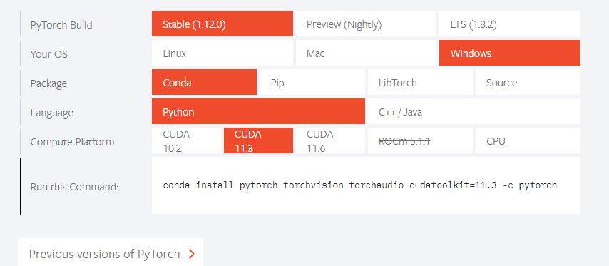 由于没有CUDA11.4的版本,所以下载CUDA11.3的版本,安装命令:conda install pytorch torchvision torchaudio cudatoolkit=11.3 -c pytorch