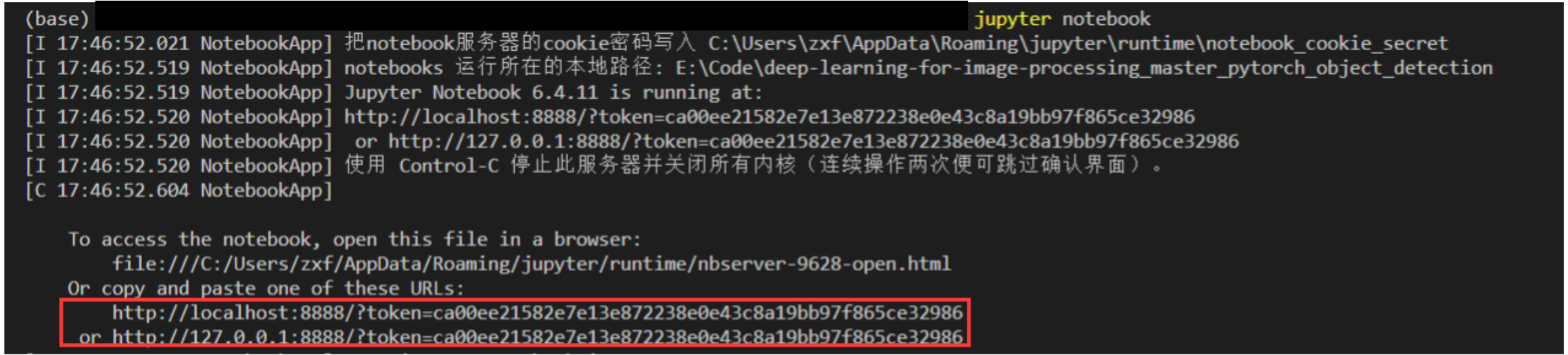 2、启动jupyter notebook,然后将红框中的其中一条网址复制到浏览器中