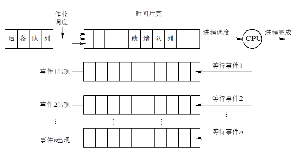 - 在执行期间,进程因为某事件而被阻塞后,被OS放入阻塞队列