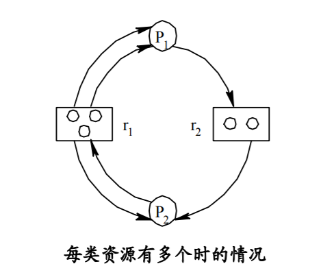 圆圈表示进程,方框表示资源,方框内点表示资源数,箭头表示“占有”或者“请求”。