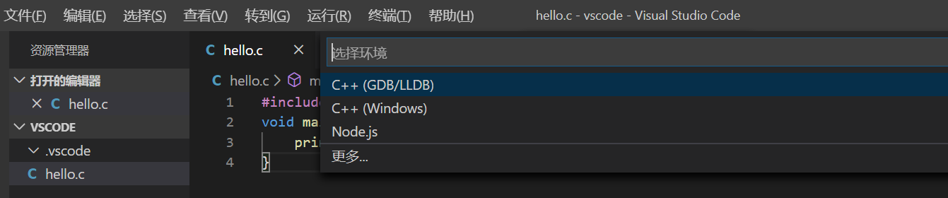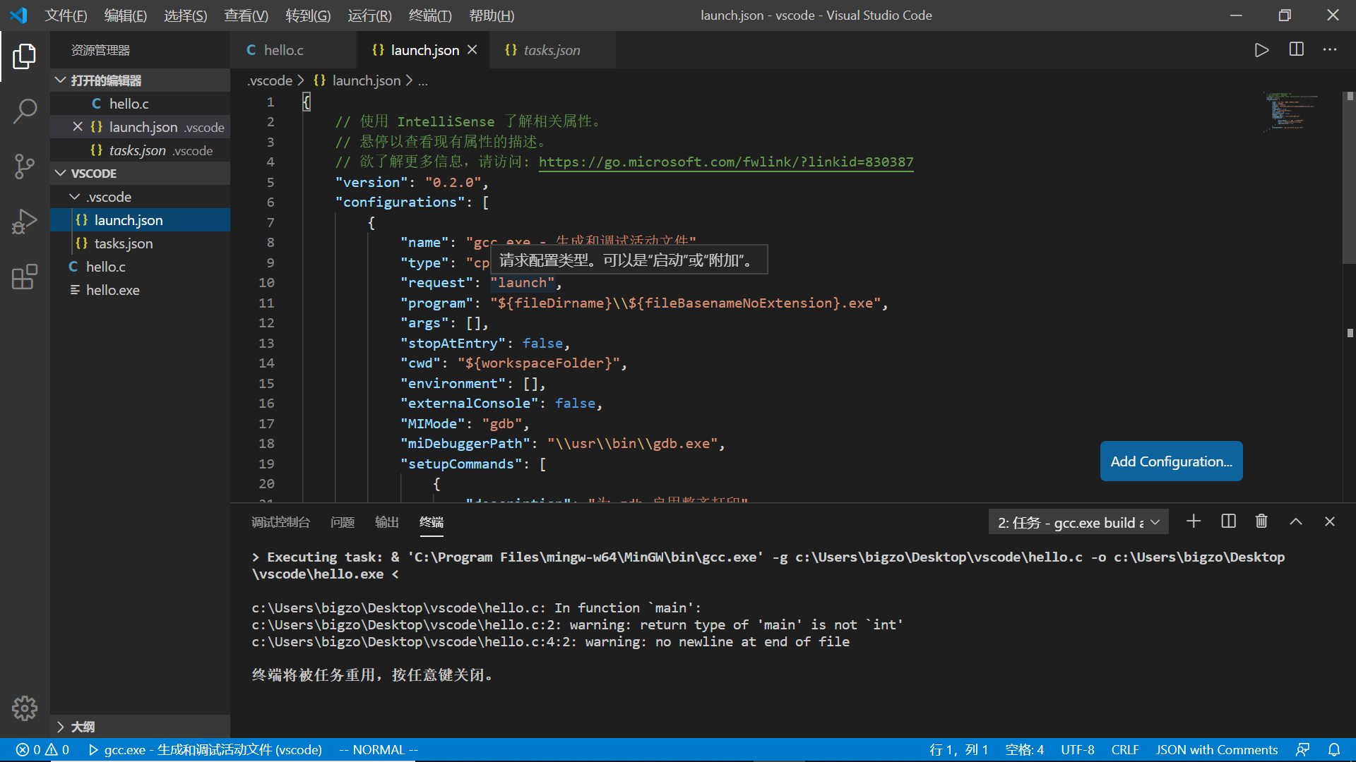 新建文件夹,创建helloworld.c文件,编辑代码,F5调试,vscode会自动创建launch,json文件以及tasks.json文件