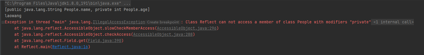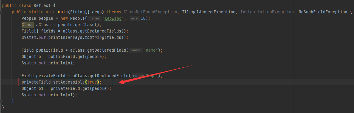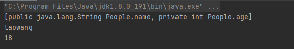 import java.lang.reflect.Field; import java.util.Arrays; public class Reflect { public static void main(String[] args) throws ClassNotFoundException, IllegalAccessException, InstantiationException, NoSuchFieldException { People people = new People("laowang", 18); Class aClass = people.getClass(); Field[] fields = aClass.getDeclaredFields(); System.out.println(Arrays.toString(fields)); Field publicField = aClass.getDeclaredField("name"); //name是public Object o = publicField.get(people); System.out.println(o); Field privateField = aClass.getDeclaredField("age"); //age是private Object o1 = privateField.get(people); System.out.println(o1); } }