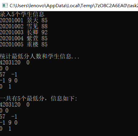 #include <stdio.h> const int N=5; // 定义结构体类型struct student,并定义STU为其别名 typedef struct student { long no; char name[20]; int score; }STU; // 函数声明 void input(STU s[], int n); int findMinlist(STU s[], STU t[], int n); void output(STU s[], int n); int main() { STU stu[N], minlist[N]; int count; printf("录入%d个学生信息\n", N); input(stu, N); printf("\n统计最低分人数和学生信息...\n"); count = findMinlist(stu, minlist, N); printf("\n一共有%d个最低分,信息如下:\n", count); output(minlist, count); return 0; } // 输入n个学生信息,存放在结构体数组s中 void input(STU s[], int n) { int i; for(i=0; i<n; i++) scanf("%ld %s %d", &s[i].no, s[i].name, &s[i].score); } // 输出结构体s中n个元素信息 void output(STU s[], int n) { int i; for(i=0; i<n; i++) printf("%ld %s %d\n", s[i].no, s[i].name, s[i].score); } // 在结构体数组s中,查找最低分学生的记录,将其存入结构体数组t中 // 形参n是结构体数组s中元素个数 // 函数返回最低分的学生人数 int findMinlist(STU s[], STU t[], int n) { // 补足函数实现 // ×××