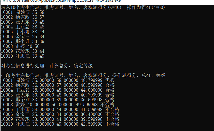#include <stdio.h> #include <string.h> const int N = 10; // 定义结构体类型struct student,并定义其别名为STU typedef struct student { long int id; char name[20]; float objective; /*客观题得分*/ float subjective; /*操作题得分*/ float sum; char level[10]; }STU; // 函数声明 void input(STU s[], int n); void output(STU s[], int n); void process(STU s[], int n); int main() { STU stu[N]; printf("录入%d个考生信息: 准考证号,姓名,客观题得分(<=40),操作题得分(<=60)\n", N); input(stu, N); printf("\n对考生信息进行处理: 计算总分,确定等级\n"); process(stu, N); printf("\n打印考生完整信息: 准考证号,姓名,客观题得分,操作题得分,总分,等级\n"); output(stu, N); return 0; } // 录入考生信息:准考证号,姓名,客观题得分,操作题得分 void input(STU s[], int n) { // 补足代码 // ××× int i; for(i=0; i<n; i++) scanf("%ld %s %f %f", &s[i].id, &s[i].name, &s[i].objective,&s[i].subjective); } //输出考生完整信息: 准考证号,姓名,客观题得分,操作题得分,总分,等级 void output(STU s[], int n) { // 补足代码 // ××× int i; for(i=0; i<n; i++) printf("%ld %s %f %f %f %s\n", s[i].id, s[i].name, s[i].objective,s[i].subjective,s[i].sum,s[i].level); } // 对考生信息进行处理:计算总分,排序,确定等级 void process(STU s[], int n) { // 补足代码 // ××× int i,j;STU temp; for(i=0;i<n;i++){ s[i].sum=s[i].objective*0.4+s[i].subjective*0.6; for(j=0;j<n-1-i;j++){ if(s[j].sum<s[j+1].sum){ temp=s[j]; s[j]=s[j+1]; s[j+1]=temp; } } if(j<n*0.1)strcpy(s[j].level,"优秀"); else if(j>=n*0.1&&j<n*0.5)strcpy(s[j].level,"合格"); else if(j>=n*0.5&&j<=n)strcpy(s[j].level,"不合格"); } }