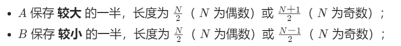 建立一个 小顶堆 A 和 大顶堆 B ,各保存列表的一半元素,且规定: