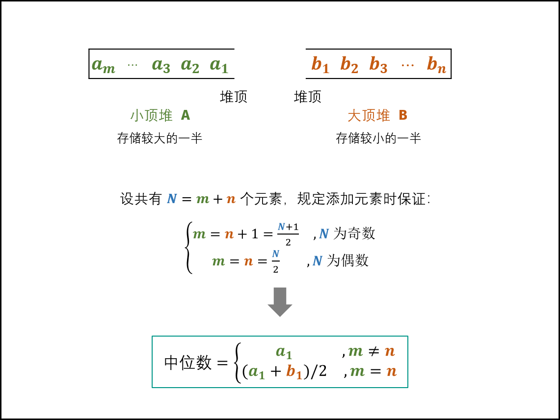 随后,中位数可仅根据 A,B 的堆顶元素计算得到。