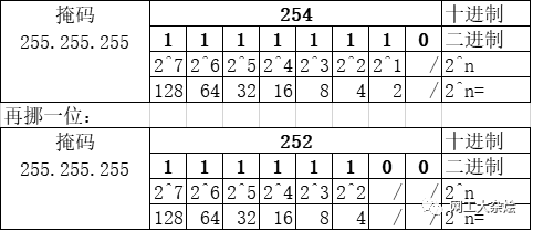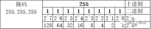 每个数的二进制中的 “1” 刚好对应IP地址格式1/4区间8bit的其中一位,也可以说是每个砝码对应8bit掩码中的一个bit位,八个砝码相加二进制正好是全1,十进制是255;