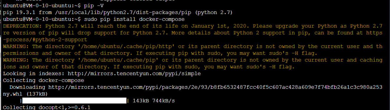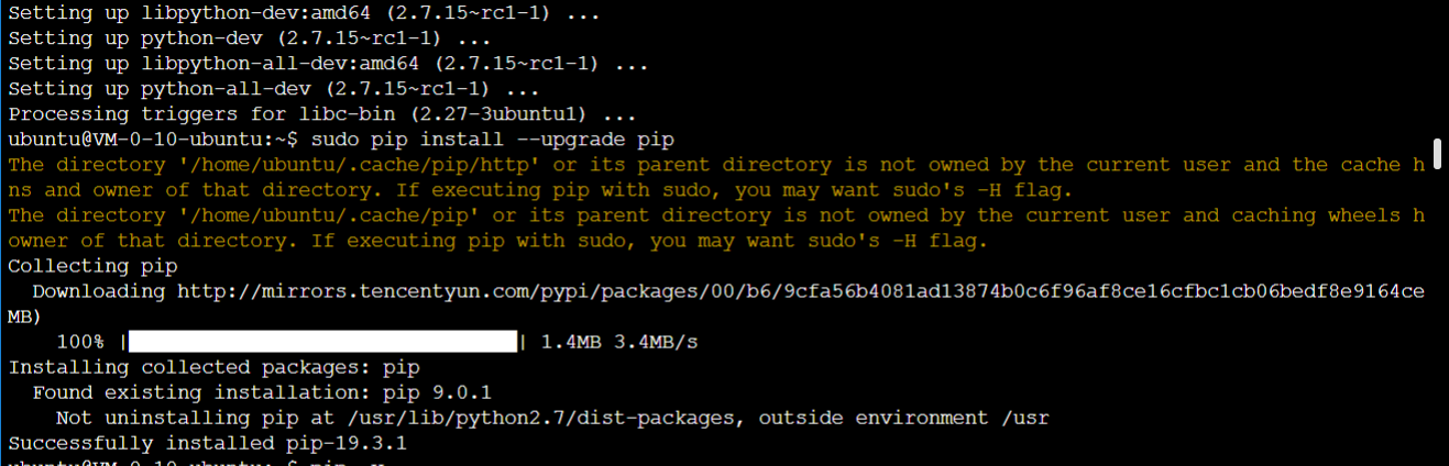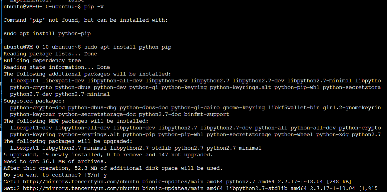 首先查看pip 之前是否安装 pip -V 因为没有安装,所以根据提示安装 sudo apt install python-pip