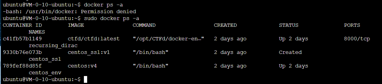 然后就是各种其他操作了,docker ps -a 直接用就是权限不足,所以才加的sudo 。好了就是这样。。。。