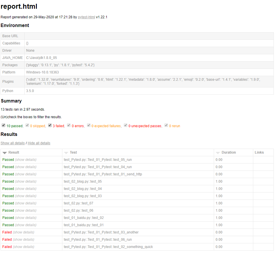 pytest-HTML是一个插件,pytest用于生成测试结果的HTML报告。兼容Python 2.7,3.6