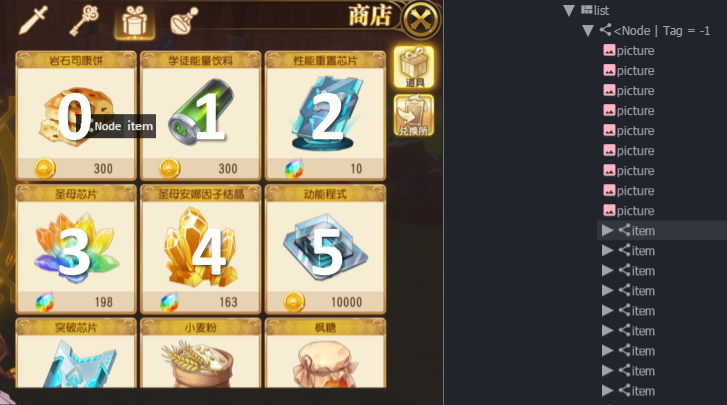 按照序号(顺序)进行选择总是按照空间排布顺序,先从左往右,再像之前那样一行一行从上到下,如下图中的数字标号,就是索引选择的序号。索引选择有个特例,一旦进行选择后,如果UI的位置发生了变化,那么下标序号仍然是按照选择的那一瞬间所确定的值。即,如果选择时1号UI现在去到了6号的位置,那么还是要用poco(...)[1] 来访问,而不是6.如果选择了之后,某个UI消失了(从界面中移除或者隐藏了),那么如果再访问那个UI则可能会发生异常,其余的UI仍可继续访问。