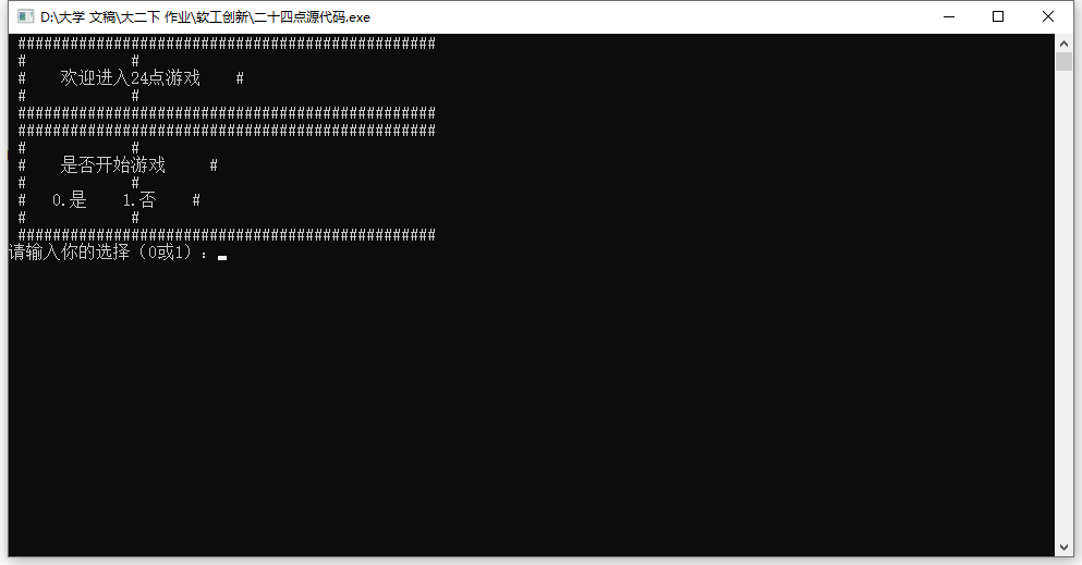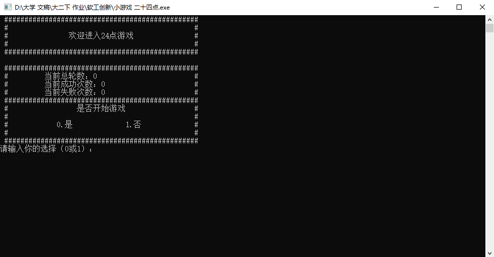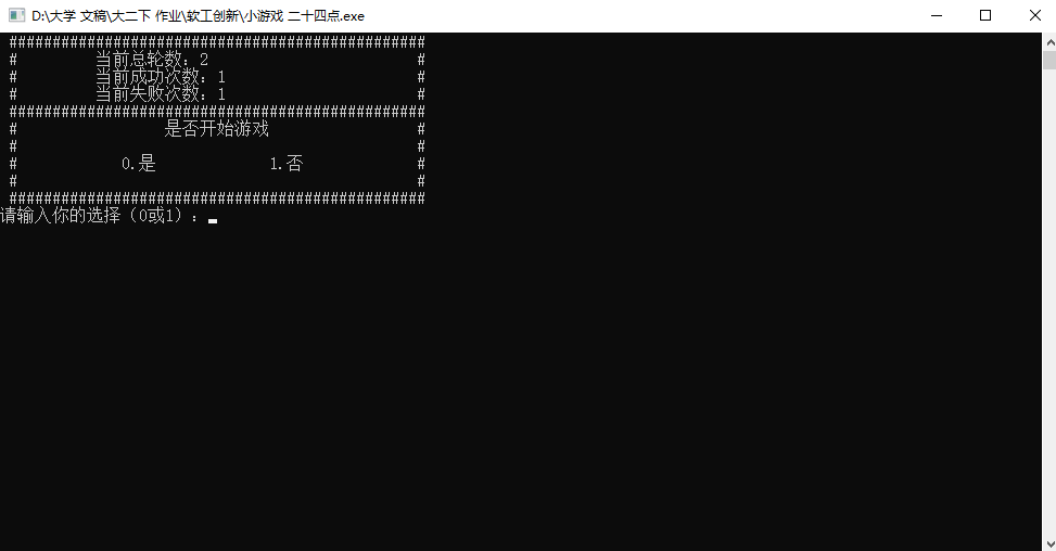 while (select) { cout<< " ################################################" << endl << " # 当前总轮数:" <<count<<"\t\t #" << endl << " # 当前成功次数:"<<countt<<"\t\t #" << endl << " # 当前失败次数:"<<countf<<"\t\t #" << endl << " ################################################" << endl << " # 是否开始游戏 #" << endl << " # #" << endl << " # 0.是 1.否 #" << endl << " # #" << endl << " ################################################" << endl;