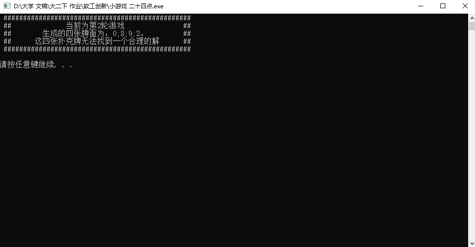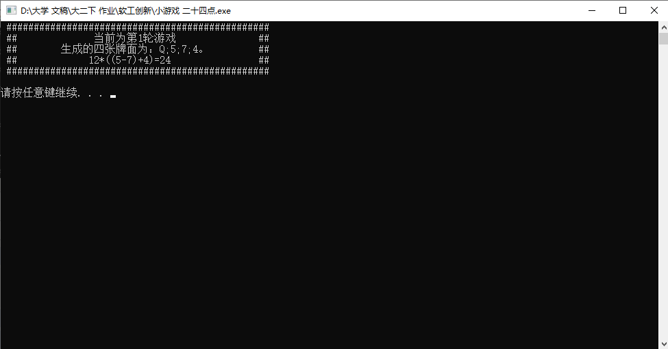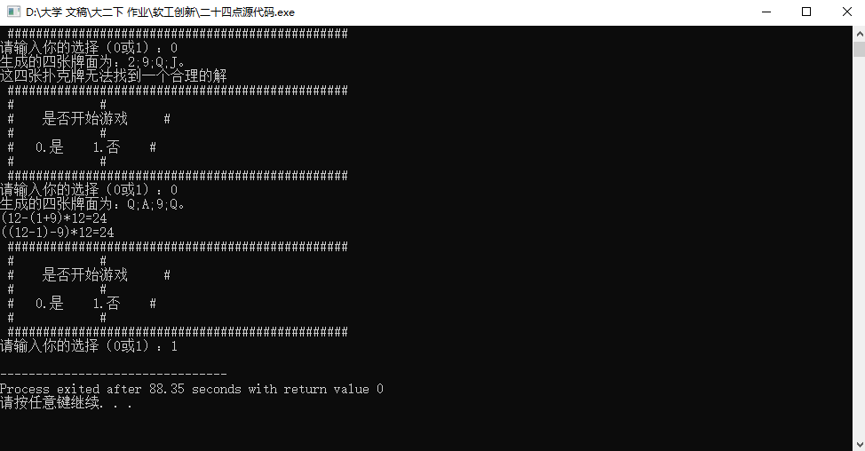 可以发现源代码功能其实很完整,整个代码最核心的部分就是计算随机抽到的四张牌否可以算出24点,如果可以就把每一种算法一一列出,这一部分功能笔者不打算改动(其实是改出了bug最后只能改回来了)。既然准备拿它来作为第一次作业的练手材料进行增量开发,那就给它加一点小功能吧。