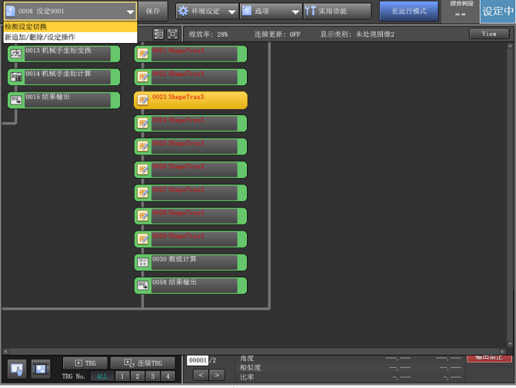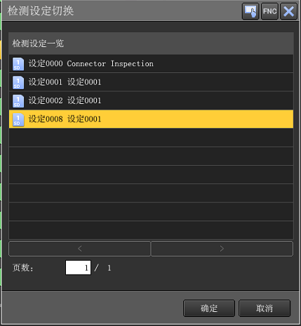 程序的切换需要在设定模式下进行,鼠标双击选择左上角的输入框,在下拉列表中选择【检测设定切换】,在弹出的检测设定切换界面选择程序,确定。