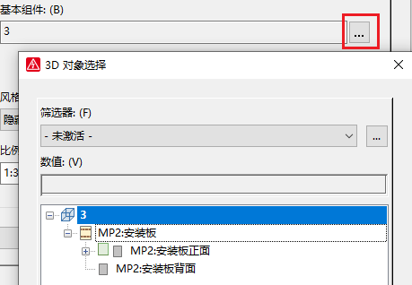 基本组件:当布局空间选择确认后,基本组件输入框中的名称自动同步布局空间的名称。若想要显示部分部件,则需选中红色框,在弹出的“3D对象选择”设置界面中,再次选择所需要显示的部分。(若全部显示,则无需对“3D对象选择”进行设置)