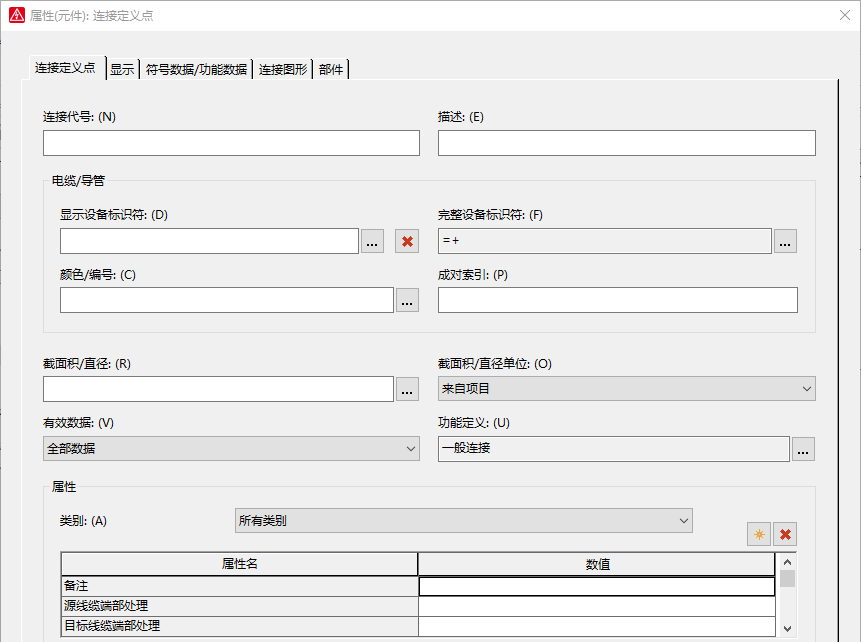 连接定义点设置中,可以添加【连接代号】、【设备标识符】、【颜色/编号】、【截面积/直径】等。