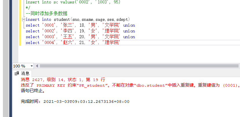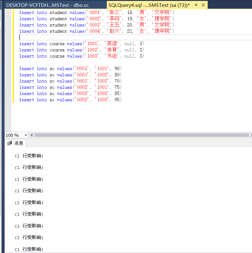 insert into student(sno, sname, sage, ssex, sdept) select '0001', '张三', 18, '男', '文学院' union select '0002', '李四', 19, '女', '理学院' union select '0003', '王五', 20, '男', '文学院' union select '0004', '赵六', 21, '女', '理学院'