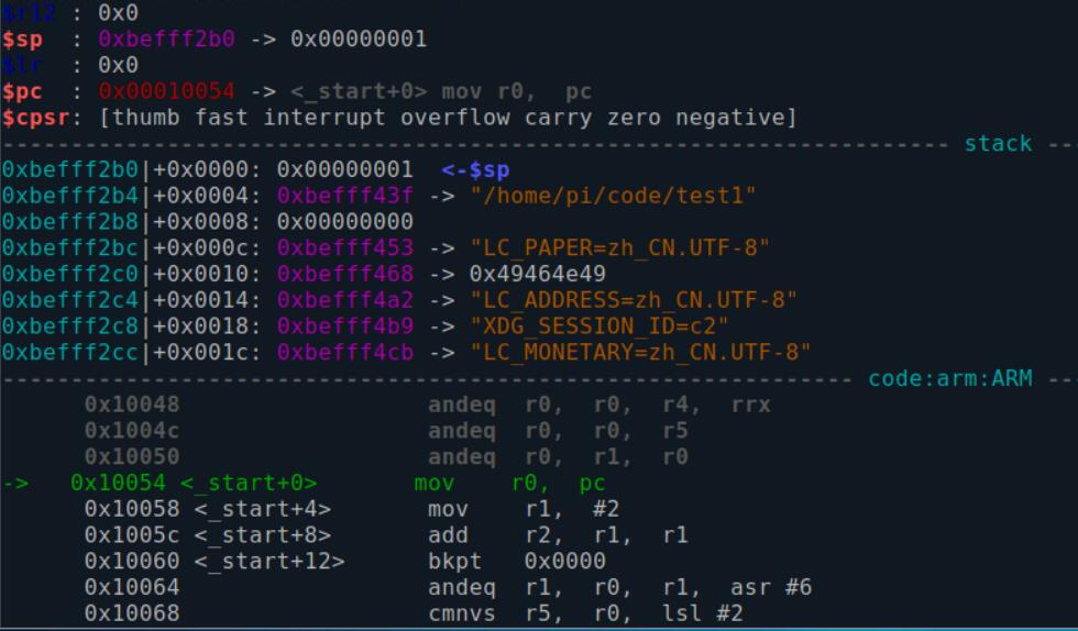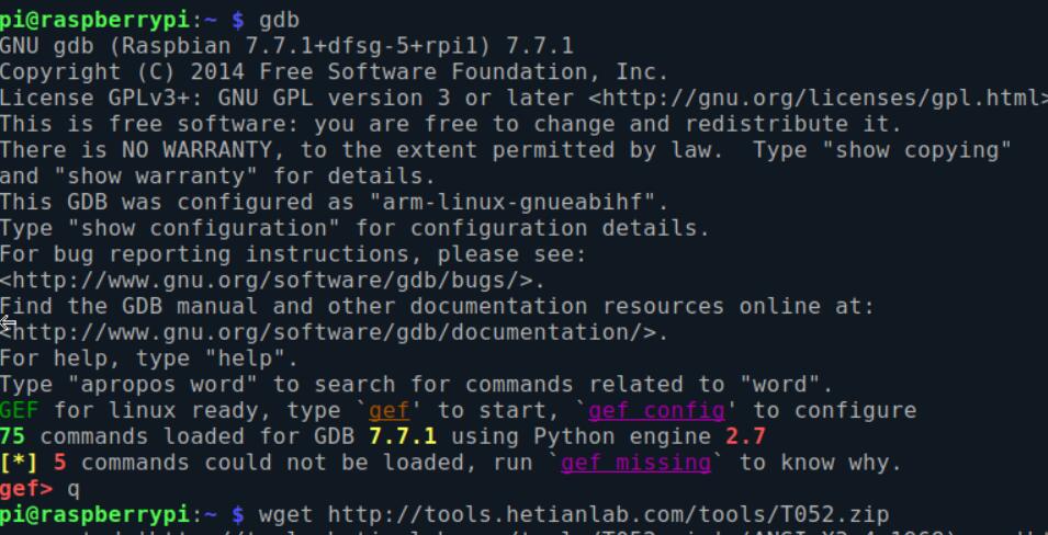 首先按部就班的安装树莓派,再用ssh链接它 (ssh是一种常用的网络协议)然后是安装gef,试验机已经安装过了所以不用管(gef是gdb的一个py插件,用于配置gdb读取的.gdbinit文件)