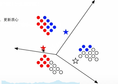 2.将一簇(如红色队列)中的所有点都算一遍,求平均值,将质心可确定为其平均点位置。其他类也按相同处理。