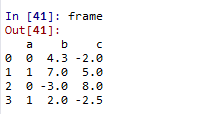 frame=DataFrame({'b':[4.3,7,-3,2],'a':[0,1,0,1],'c':[-2,5,8,-2.5]})