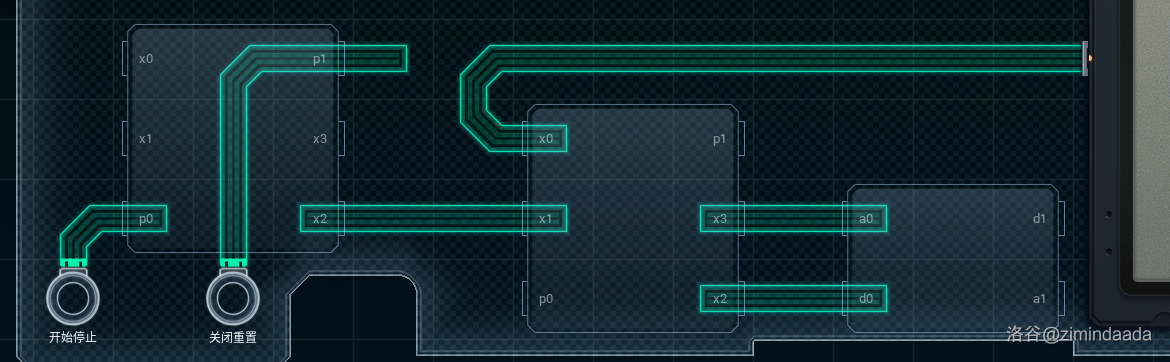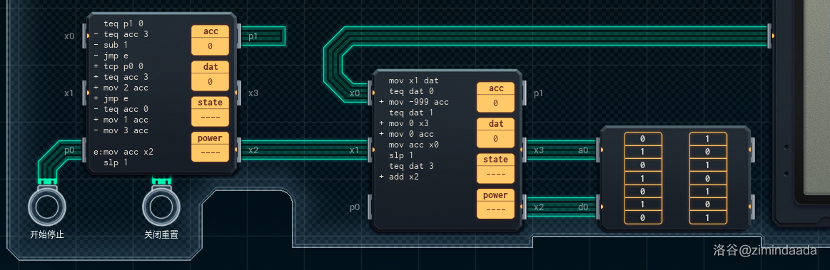 重新看了一眼发现左侧负责输入的芯片写的乱麻一样,本质就是要区分输入,要么是-999不用管,要么非负数是卡号一起输入完,要么是-1处理输入。处理卡号的输入没必要用acc来做循环变量,直接jmp回开始冲新处理一边即可。于是我们省下了大量的代码行数,为正解做铺垫。