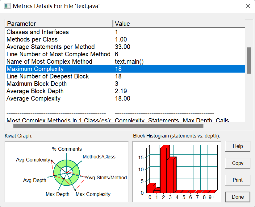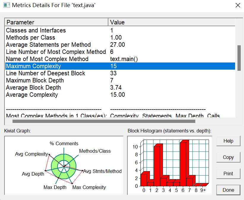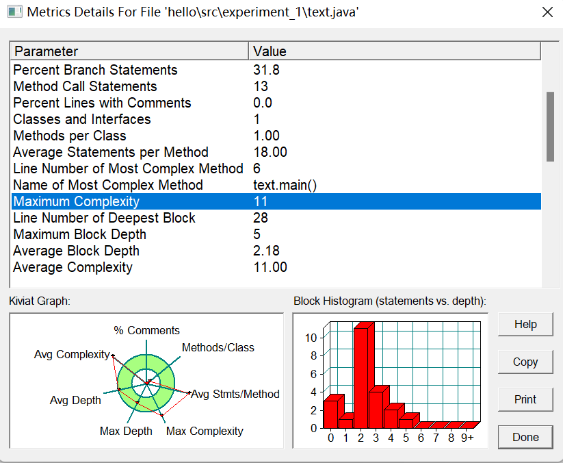 通过sourceMonitor的生成报表内容中可以看出圈复杂度为11,则表示代码中的if语句使用过多,且全在main方法中实现。而如果多通过方法的建立,通过返回值判断格式是否错误。通过不同的方法完成功能的实现,也可以使代码更易读、简洁。