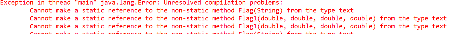 2.同一个类下的方法同类中的静态方法只能调用其他静态成员(变量和方法),不能调用非静态成员。static main方法要调用其他的方法,则在其他方法前要加上static。刚开始运行时出现了下列的错误,而后我回想起老师上课时所讲的内容,发现我新建的方法是非静态方法,应该要加上static。