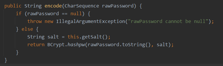 以我的修改密码方法为例,第一行获取用户信息不用看,直接找到与密码相关的方法,比如setPassword设置密码,其中PASSWORD_ENCODER.encode()方法就是我的加密算法