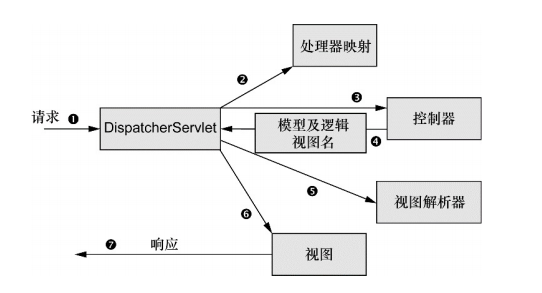 ① 请求离开浏览器,带着用户所请求内容的信息,包括URL,表单信息等等。请求首先到达前端控制器DispatcherServlet。