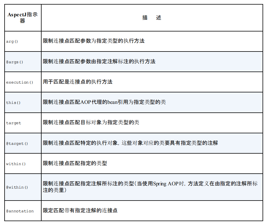 在Spring AOP中,要使用AspectJ的切点表达式语言来定义切点。下面是Spring AOP支持的切点指示器。