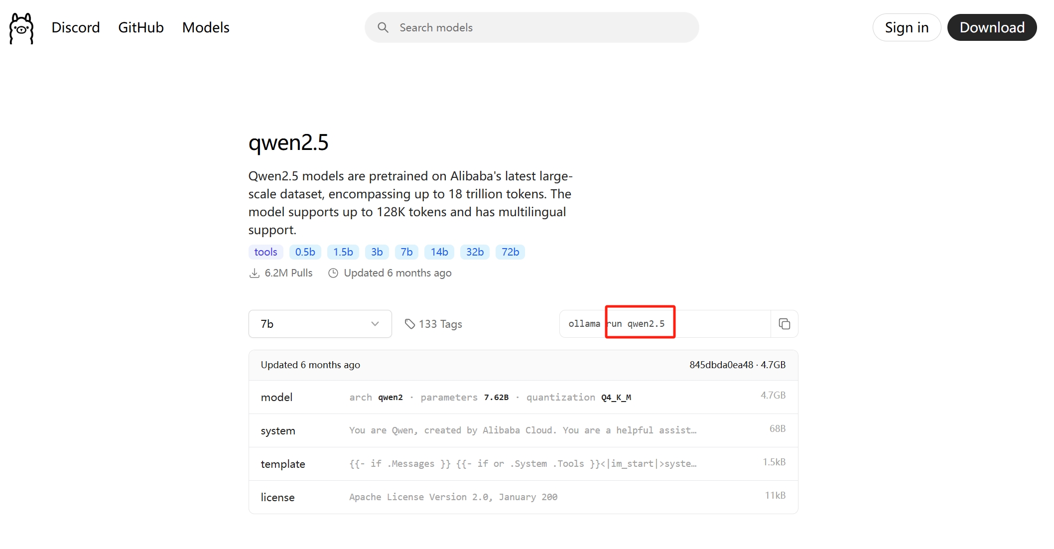 只是这样写也能运行,但会导致模型问答回复时无法自动终止,还需要配置模版信息,模版可以在 ollama 官网对应的模型下面找: