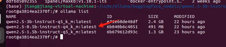 导入成功之后,我们就可以通过 list 命令,看到名为 qwen2-05b-q4 的本地模型了,后续可以和其他模型一样进行管理了。