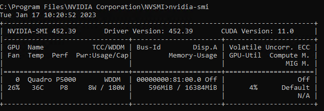 搜索cmd,输入nvidia-smi 。如果找不到这个指令那就cd到 C:\Program Files\NVIDIA Corporation\NVSMI 中里面有个nvidia-smi.exe。在cmd中运行这个程序。