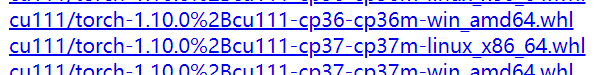 前面的cu代表gpu,这里不能选cpu的。cu111代表cuda的版本是11.1的。torch1.10.0代表torch的版本是10.0的。cp36代表python的版本是3.6.win-amd64代表windows系统安装的。