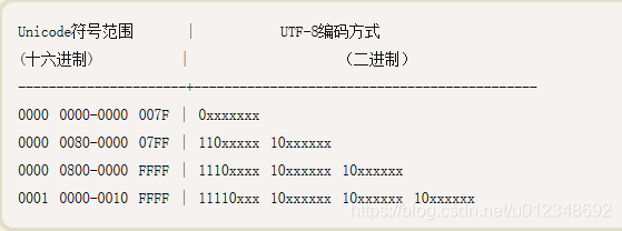 (2)对于n字节的符号(n>1),第一个字节的前n位都设为1,第n+1位设为0,后面字节的前两位一律设为10,剩下的没有提及的二进制位,全为这个符号的unicode码。