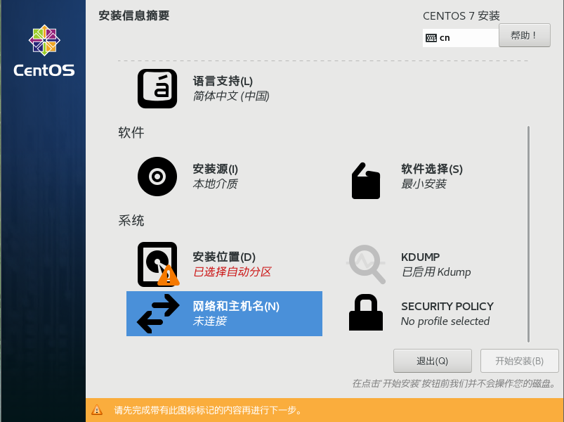2,进入安装信息摘要页面(主页),下滑,先选择网络和主机名,