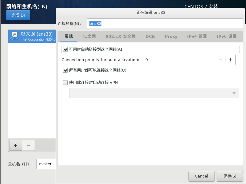 3,把主机名修改为master,点击应用。打开以太网,点击配置
