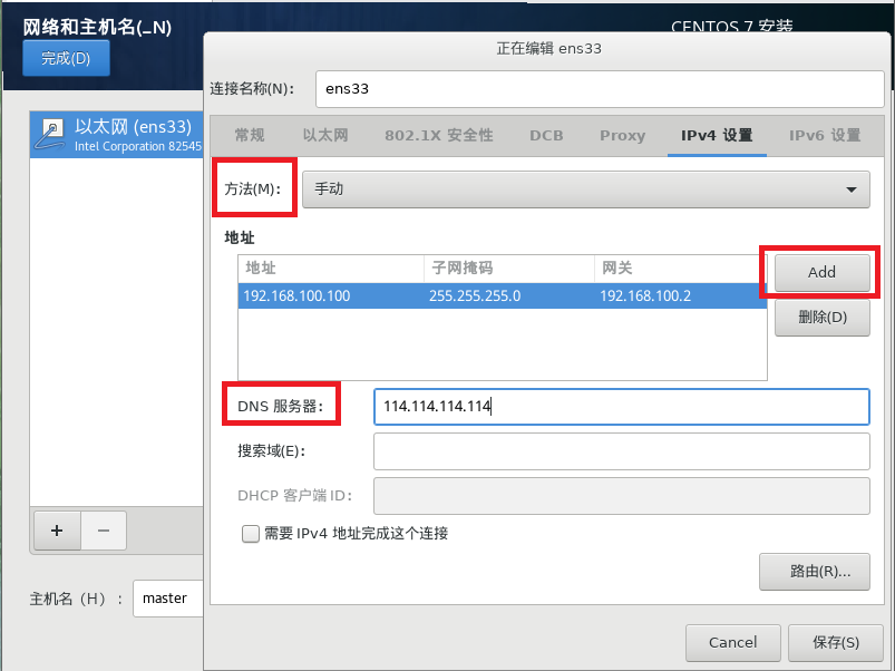 5,选择IPv4设置,将方法修改为手动,点击Add添加网络,地址为192.168.100.100,子网掩码为255.255.255.0,网关为192.168.100.2。将下面的DNS服务器设置为114.114.114.114,保存即可