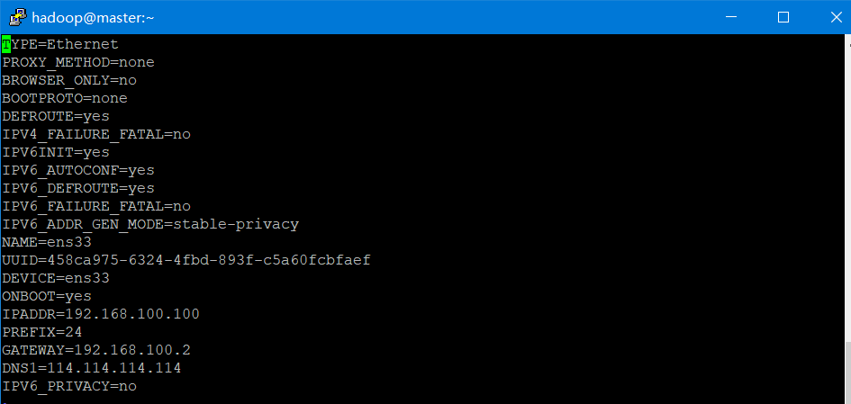 [hadoop@master ~]$ sudo vi /etc/sysconfig/network-scripts/ifcfg-ens33