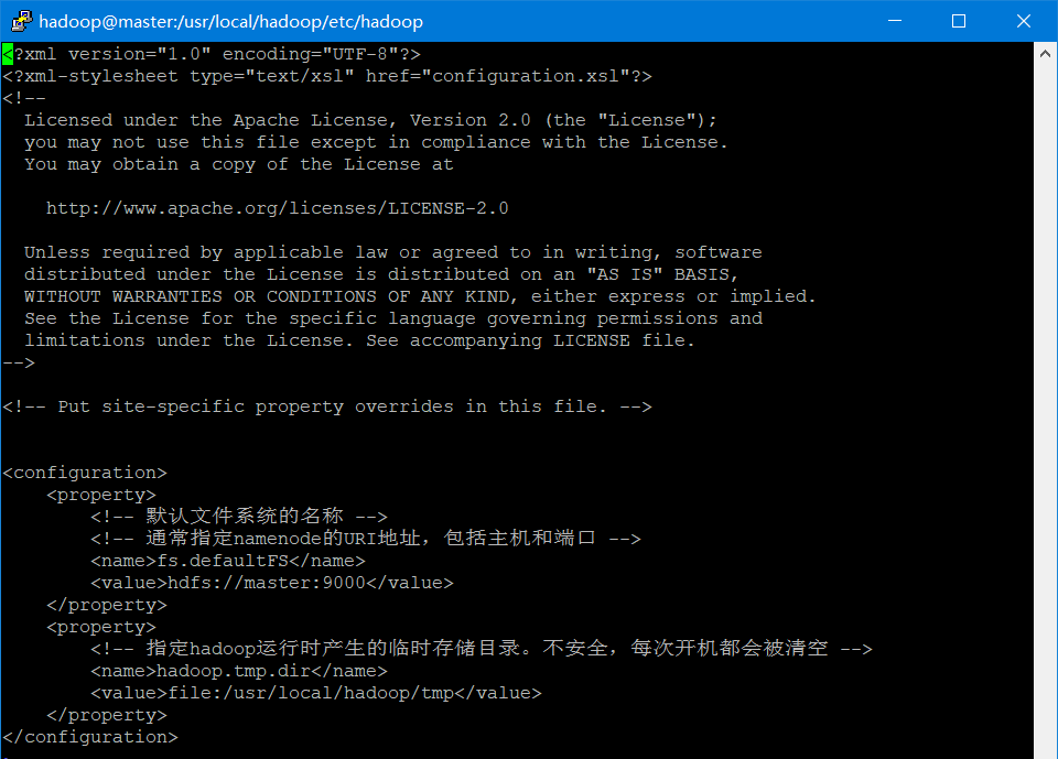 <configuration> <property> <!-- 默认文件系统的名称 --> <!-- 通常指定namenode的URI地址,包括主机和端口 --> <name>fs.defaultFS</name> <value>hdfs://master:9000</value> </property> <property> <!-- 指定hadoop运行时产生的临时存储目录。不安全,每次开机都会被清空 --> <name>hadoop.tmp.dir</name> <value>file:/usr/local/hadoop/tmp</value> </property> </configuration>