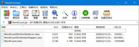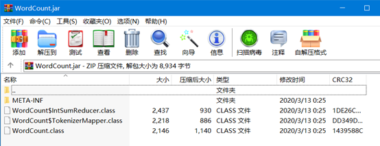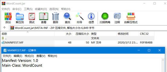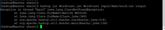 失败 Exception in thread "main" java.lang.ClassNotFoundException: at java.lang.Class.forName0(Native Method) at java.lang.Class.forName(Class.java:348) at org.apache.hadoop.util.RunJar.run(RunJar.java:214) at org.apache.hadoop.util.RunJar.main(RunJar.java:136) hadoop jar WordCount.jar WordCount input/demo/word.txt output 删除MANIFEST.MF文件成功