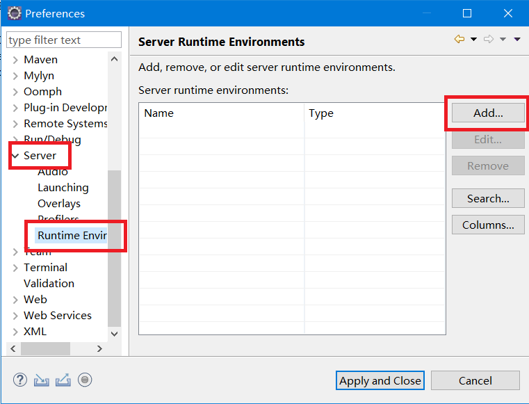 打开 eclipse ,导航栏 Window -> Preferences,然后 Server -> Runtime Environments,点击 Add
