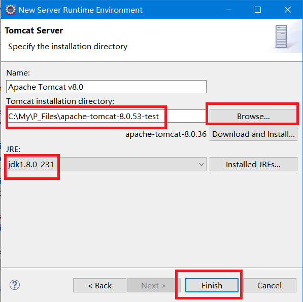选择自己对应的 Tomcat目录 和 JRE 后,点击 Finish